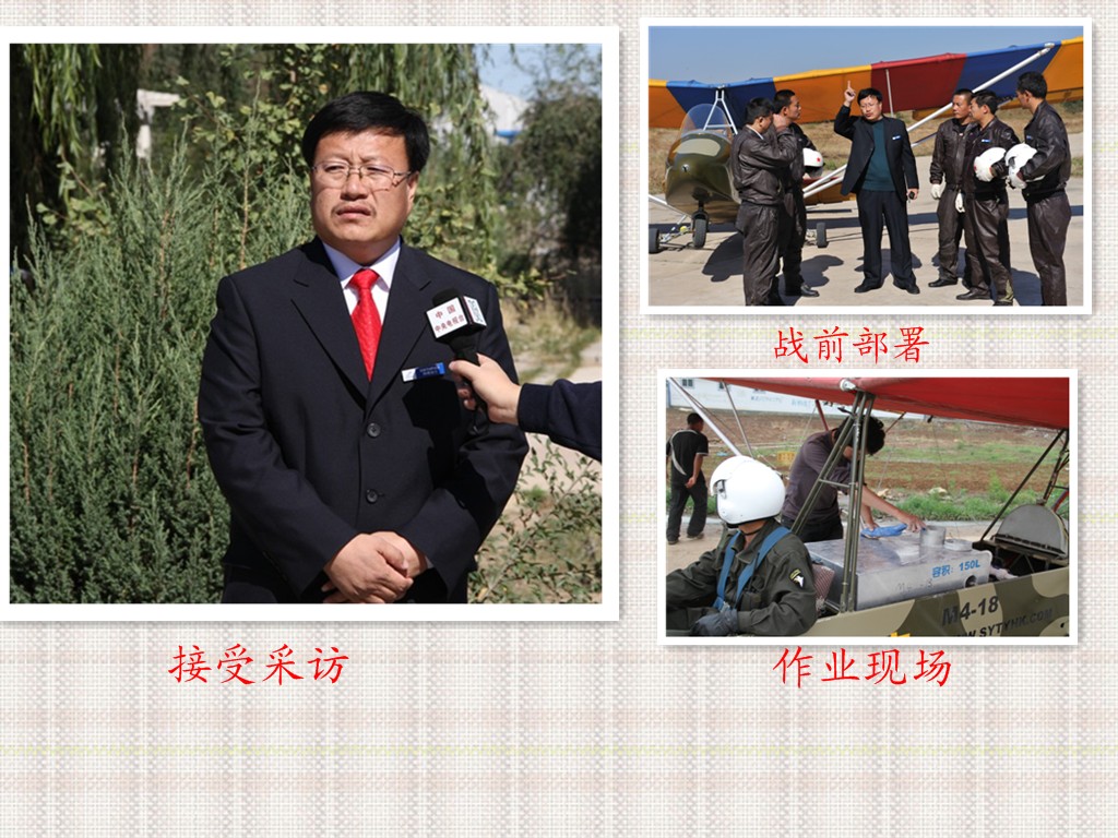 ,而是毅然決然的走上里一條充滿艱辛的打拼之路,在別人笑之為天方夜譚的情況下,1999年四處投親靠友籌集資金從北京航空航天大學(xué)購進(jìn)了一架蜜蜂4超輕型飛機(jī),與此同時(shí)它成就了內(nèi)蒙古自治區(qū)第一個(gè)私人擁有飛機(jī)的人,飛機(jī)有了,他東奔西走,開始學(xué)習(xí)、探索、研究制作超輕飛機(jī)飛機(jī)播種和飛機(jī)滅蟲設(shè)備,經(jīng)過4年的反復(fù)試驗(yàn),終于在2003年設(shè)備試驗(yàn)成功,但沒有相關(guān)手續(xù)私人飛機(jī)不允許私自飛行,于是成立航空公司的想法在心中勾畫,他開始了中國第一家超輕型飛機(jī)通用航空公司的籌建工作,一己之力不可成江河,于是他伙同一直支持他的妻子四處請專家、找能人,終于在2006年經(jīng)過三年努力國家民航華北地區(qū)管理局為其頒發(fā)了通用航空公司籌建許可證,于是他又四處籌措資金,投入到籌建工作之中,2008年六月經(jīng)民航華北地區(qū)管理局驗(yàn)收合格并頒發(fā)通用航空運(yùn)營許可,與此同時(shí)他的飛機(jī)播種、飛防滅蟲兩項(xiàng)實(shí)用新型專利獲得通過,國家知識(shí)產(chǎn)權(quán)局頒發(fā)了實(shí)用新型知識(shí)產(chǎn)權(quán)證書。(鏡頭七)設(shè)備特寫(包括專利證書)邱志剛一個(gè)不屈不撓的東北漢子,在平凡的人生道路上創(chuàng)造了不平凡的業(yè)績,創(chuàng)造了不平凡的人生價(jià)值。創(chuàng)造了人生的豪邁與神奇。