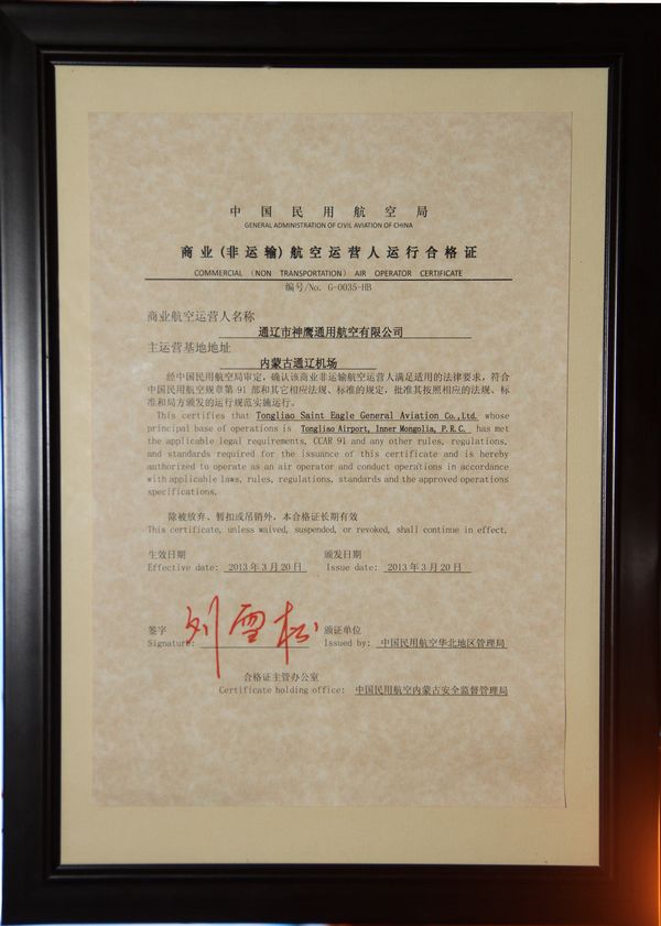 2013年3月28日,通遼神鷹通用航空有限公司CCAR-91部運行合格審定頒證儀式在神鷹通航召開。神鷹通航孫學慧副總經(jīng)理主持了本次會議,內(nèi)蒙古監(jiān)管局副局長李陸康向通遼神鷹通用航空公司頒發(fā)了《商業(yè)非運輸航空運營人運行合格證》, 內(nèi)蒙古機場集團公司通遼分公司領導參加了頒獎儀式。這是內(nèi)蒙古地區(qū)第三家獲得CCAR-91部運行許可的通用航空公司,也彌補了內(nèi)蒙古中東部地區(qū)通航事業(yè)的空白。